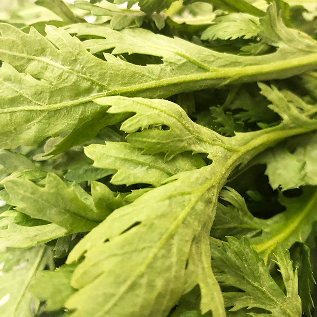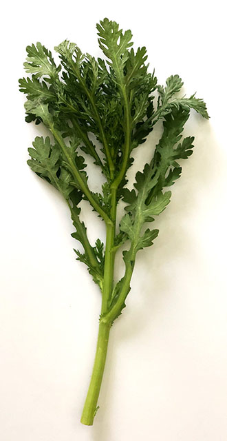 There are two kinds of garland chrysanthemum: one with a broader rounder leaf, and one with narrower, spikier leaves.